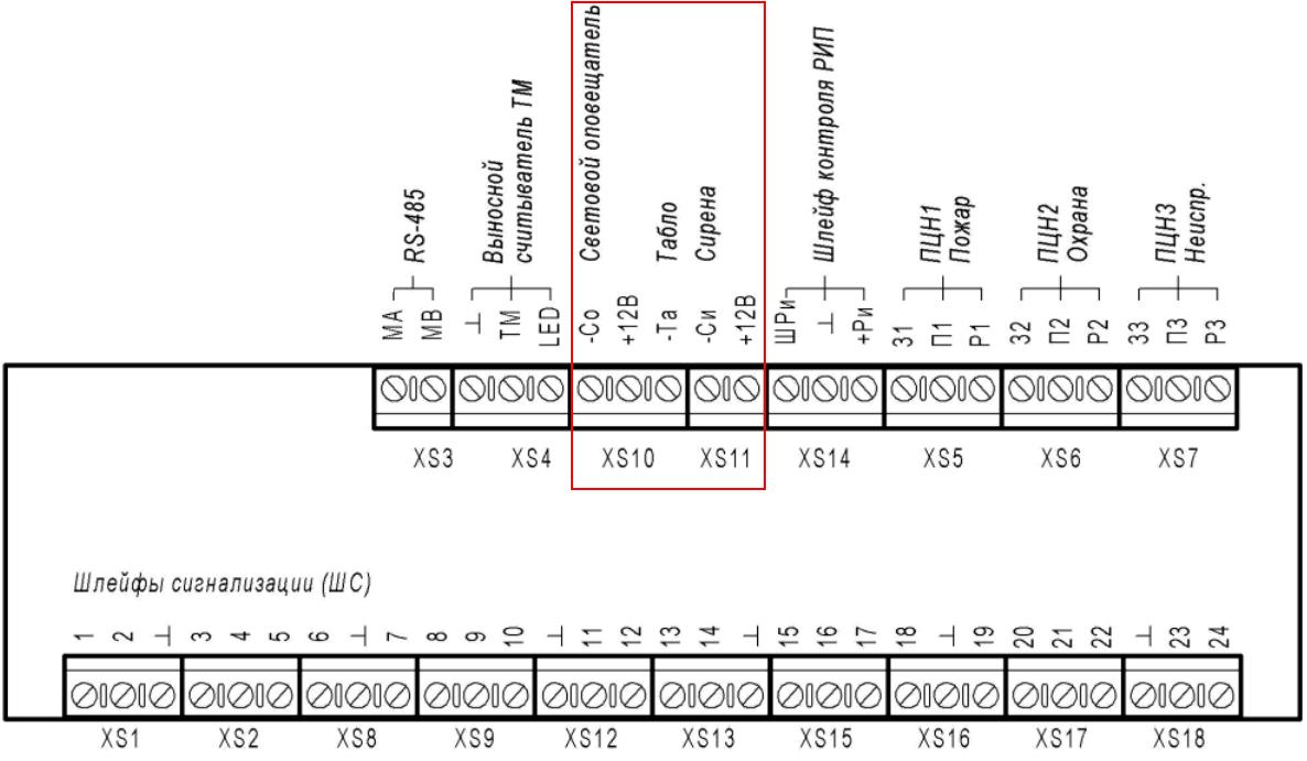 ЗО - звуковой оповещатель, то есть клеммы "-Си" и "+12", где обязательно должен быть установлен оконечный диодно-резистивный элемент с соблюдением полярности (серое кольцо диода - к "+"). Диоднорезистивная сборка устанавливается в клеммы прибора, только если не подключено ни одного оповещателя. Если подключена, хотя бы, одна сирена (табло "Выход", охранная лампа), то оконечный элемент выносится на последний подключенный оповещатель с соблюдением полярности.