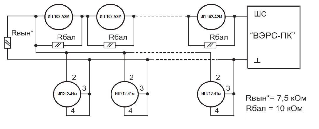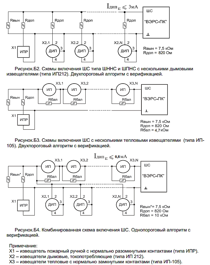 это. На странице 44, это приложение Б, приведен Рисунок Б5 - типовая схема включения дымовых ИП в шлейф прибора. Под рисунками есть Примечания, где отдельно указаны номиналы Rдоп (порогозадающего резистора для ИП): 820 Ом для большинства дымовых пожарных извещателей типа ИП212-... или 470 Ом - для дымовых ИП производства ГК Рубеж (например, ИП212-41).