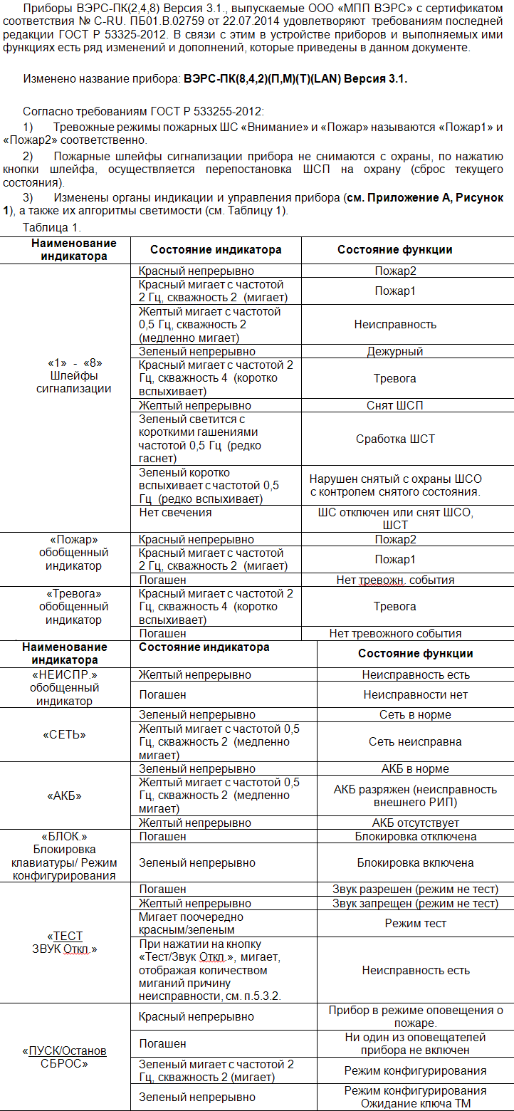 Приборы ВЭРС-ПК имеют дополнительную проверку срабатывания двух пожарных извещателей в ШС. После обнаружения двух сработавших извещателей происходит сброс питания ШС, с последующим его восстановлением, если после восстановления извещателей прибор снова фиксирует два сработавших извещателя только тогда он выдает сигнал "ПОЖАР". Это обстоятельство необходимо учитывать при имитации срабатывания двух извещателей в пожарном ШС.